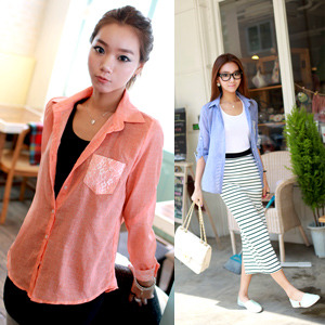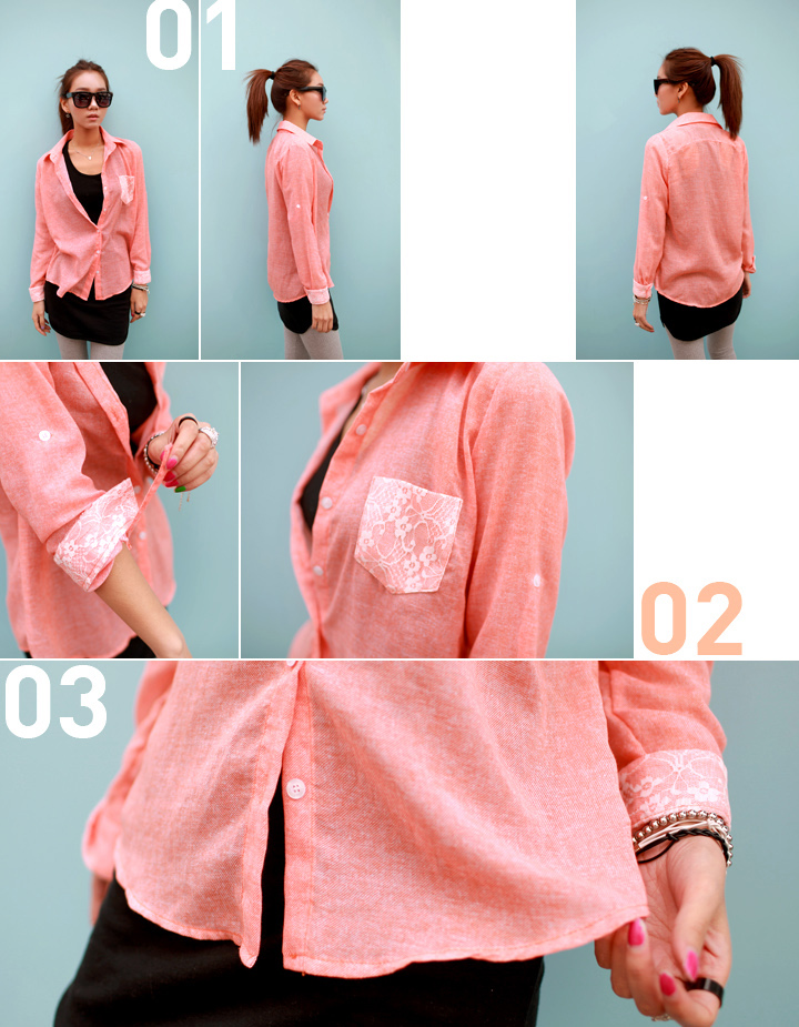 1. เสื้อเชิร์ต กระเป๋าด้านหน้าและชายแขนแต่งผ้าลูกไม้เพิ่มความหวานและวินเทจ