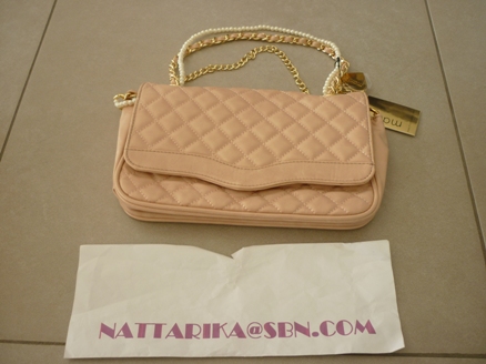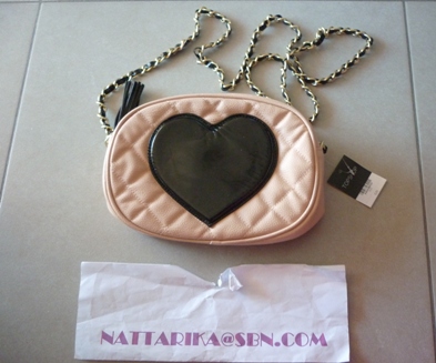 กระเป๋าหนังสีชมพูหวานสายมีสามเส้นทอง ไข่มุก ห้อยหัวใจทอง