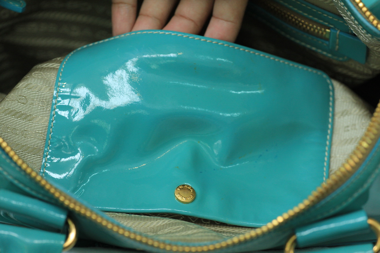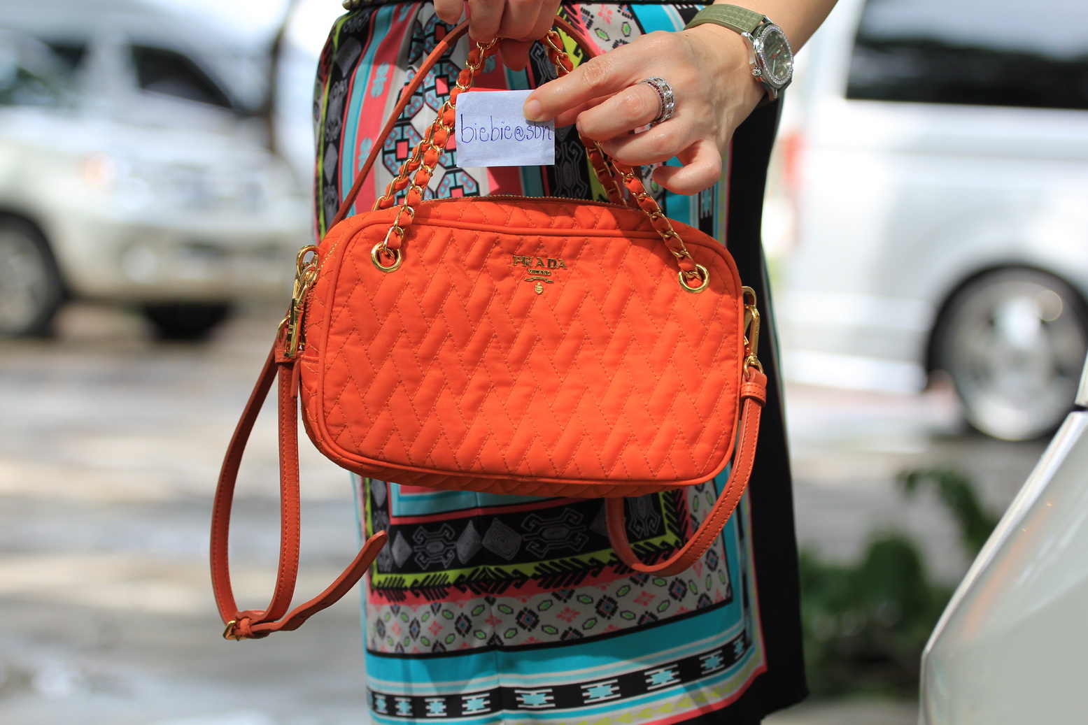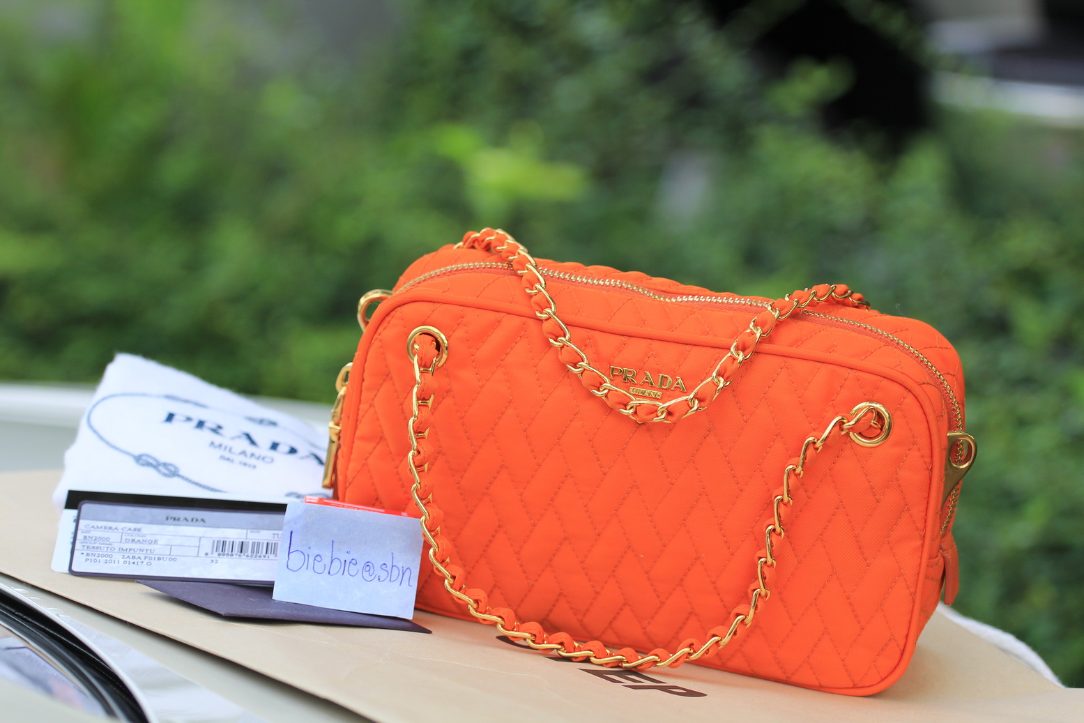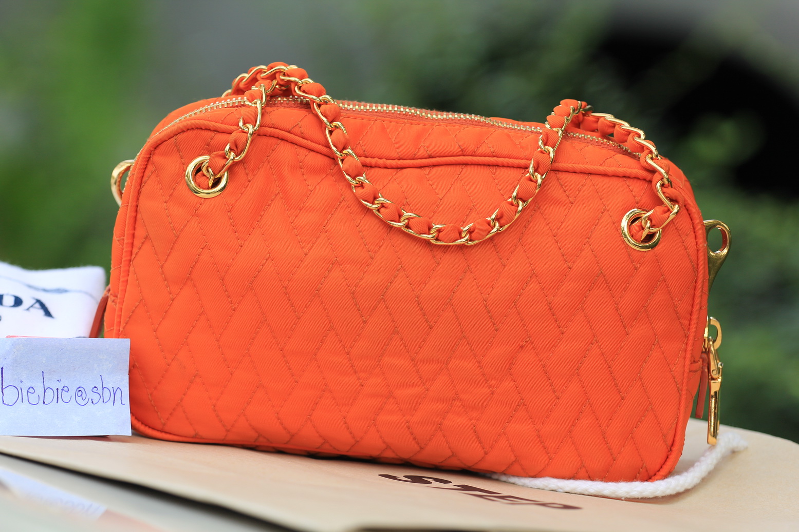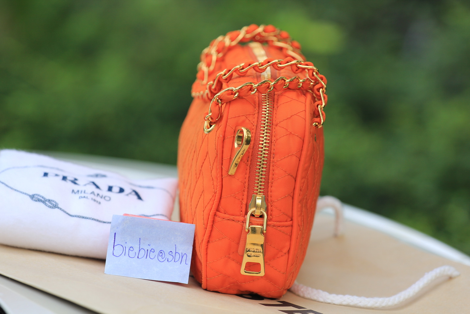 Used Prada ส้ม อะไหล่ทอง ผ้าทอถัก มีสายสั้นติดกระเป๋า และ สายยาว