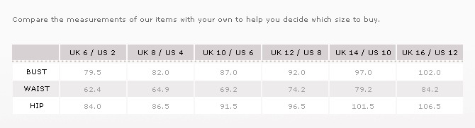 ตารางขนาด Topshop ค่ะ