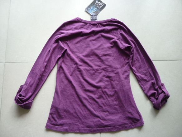 ใหม่ป้ายห้อยเสื้อผ้าคอตต้อนสีม่วงสวยแขนสียาวพับเบิ่ลปลายแขน