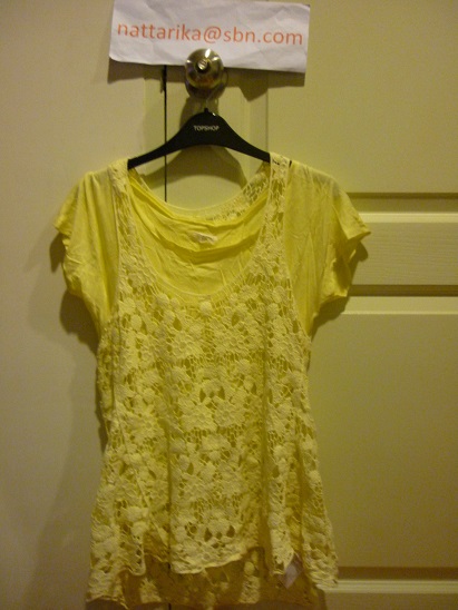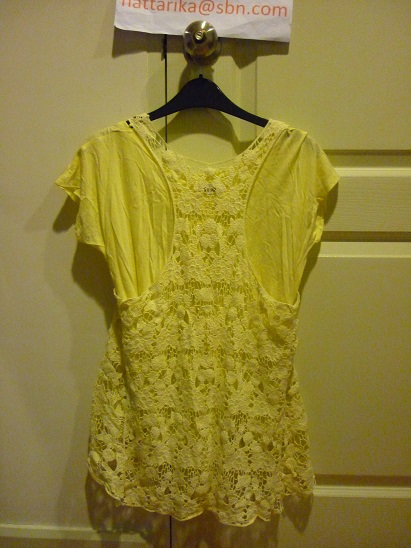 ตัวในผ้าคอตต้อนแขนสั้นสีเหลือง ตัวนอกเป็นผ้าลูกไม้สีเหลือง ของจริงใหม่ขั้นเทพซื้อมาใส่ครั้งเดียว