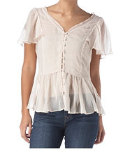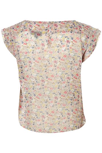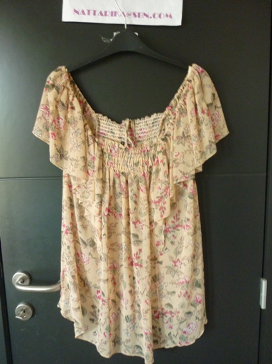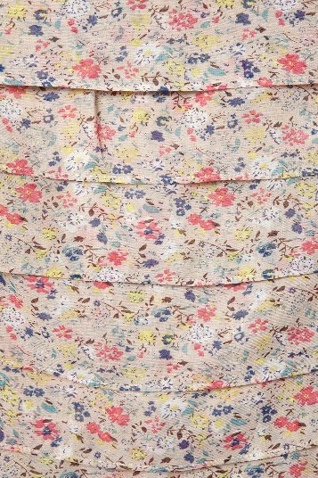 เสื้อผ้าชีฟองสีลายดอกไม้เล็กๆโทนสีครีม ดีเทลคอและแขนระบายน่ารักๆ