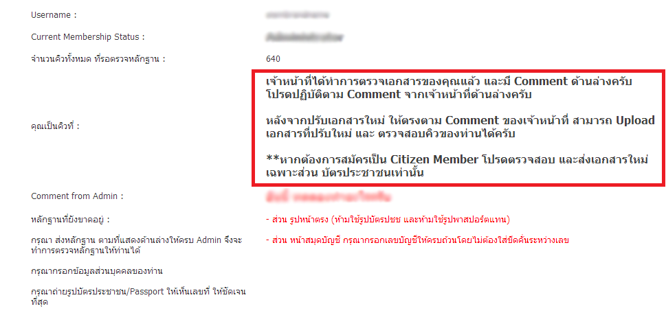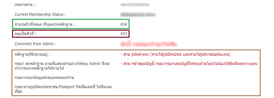 โดยปกติ หากเจ้าหน้าที่ตรวจเอกสารแล้ว ถ้าเอกสารไม่ผ่าน เจ้าหน้าที่จะให้ Comment เอกสารไว้ ให้เพื่อนสมาชิกนำไปปรับเอกสารเพื่อจะส่งเข้ามาใหม่ ดังนั้น เมื่อเจ้าหน้าที่ตรวจเอกสารแล้ว และยังไม่ผ่าน ตัวเลขในช่อง "คุณเป็นคิวที่" จะเปลี่ยนเป็น ข้อความที่ให้ตรวจสอบ Comment ของเจ้าหน้าที่ครับ