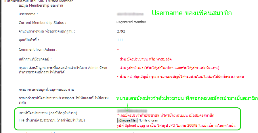 โดยที่ สำเนาบัตรประชาชน จะต้องมีเลขประจำตัวประชาชน ตรงกับ เลขประจำตัวประชาชน ที่ เพื่อนสมาชิกได้กรอก ในตอนสมัครสมาชิก เป็น Registered Member เข้ามาในระบบชุมชน