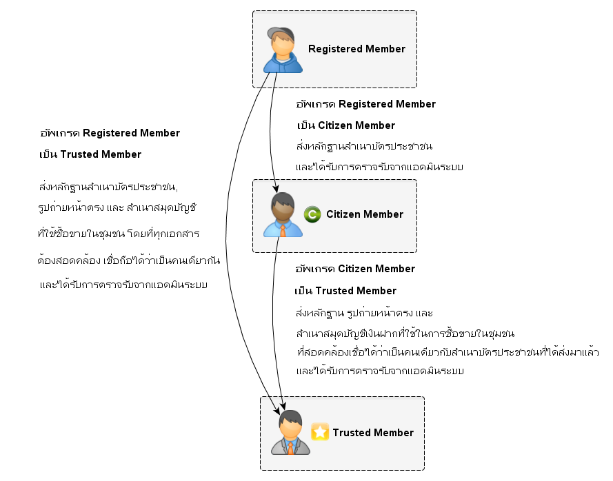 สมาชิกที่ได้เป็น สมาชิกประเภท Trusted member อยู่แล้ว ไม่ต้องส่งเอกสารใหม่ เพราะสถานะสมาชิก Trusted member มีความน่าเชื่อถือสูงกว่า Citizen Member เนื่องจาก ส่งเอกสารยืนยัน บุคคล ครบทั้งสามประเภท
