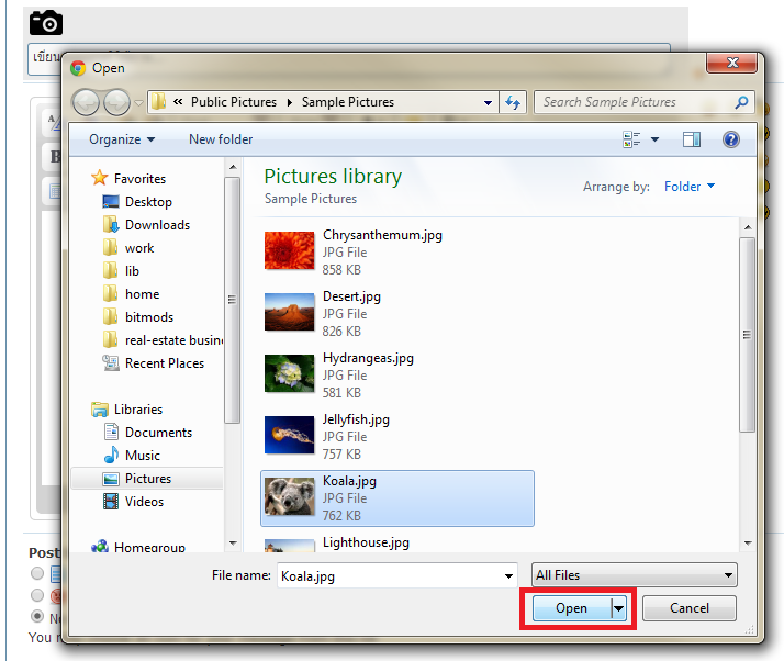 เมื่อคลิ๊กที่ปุ่มที่เป็นรูปกล้องถ่ายรูป (ที่อยู่ในกรอบสีแดงด้านบน) จะมีหน้าต่างให้เลือกไฟล์รูป เพื่อทำการอัพโหลดเข้าระบบเพื่อใช้ในการสร้างเนื้อหา ด้วยเครื่องมือนี้ เพื่อนสมาชิก จะสามารถโพสต์รูปเข้าระบบได้โดยตรง ไม่ต้องฝากรูปที่เว็บฝากรูป