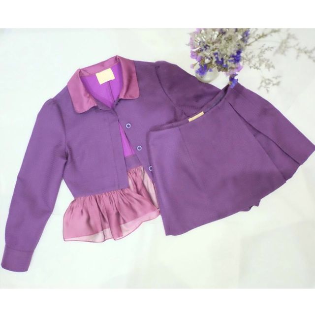 เสื้อผ้าฝ้ายชาแนลต่อระบายด้วยผ้าไหมชีฟอง ใส่คู่กับกระโปรงกางเกงตัดเย็บด้วยผ้าฝ้ายชาแนลสีม่วงเข้าเซตกันคะ
