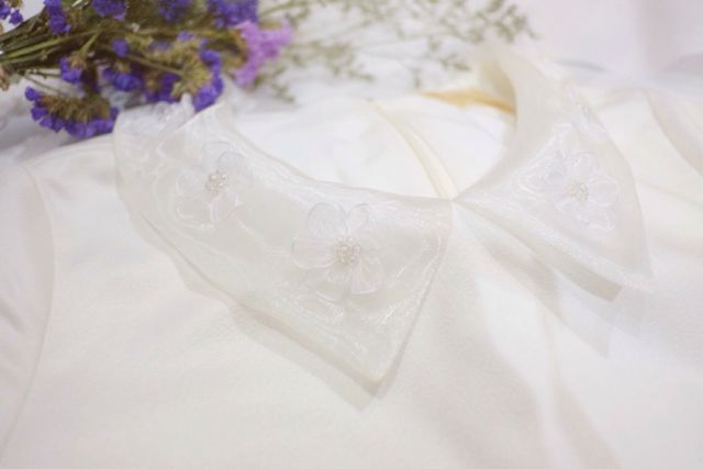 จั๊มสูมสีขาวผ้าปั๊มลายหนัง ตกแต่งปกด้วยผ้าแก้วหนาอย่างดีปักด้วยดอกไม้ผ้าแก้วสีขาว