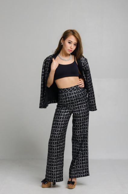 ผ้าชาแนลลายขวางสีครีมมีดีเทลบริเวณคอปกใส่คู่กับกระโปรงปลายระบาย