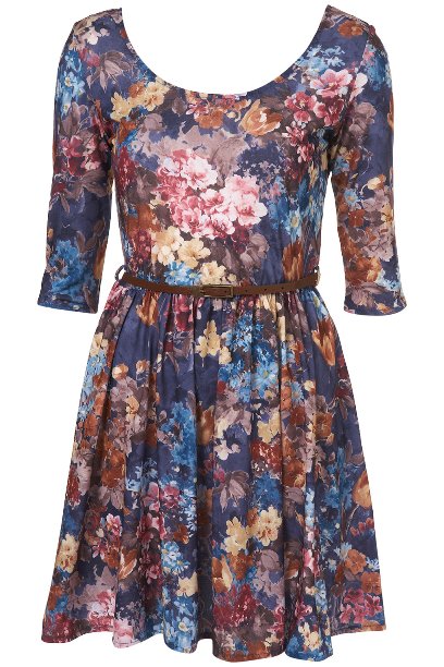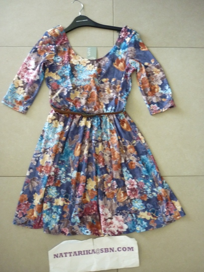 เดรสพิมพ์ลายดอกไม้คาดด้วยเข็มขัด แบนประมาณศอก