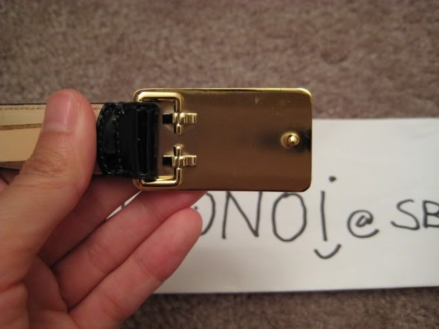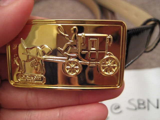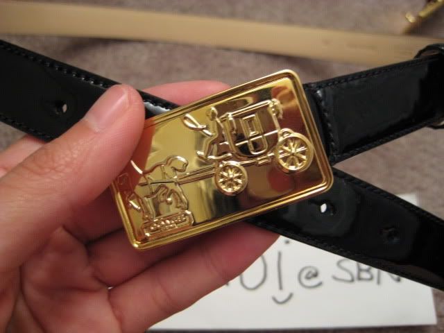 9. เข็มขัดรุ่นหนังเงา patent leather skinny belt ขนาดหนา 2cm ตัวหัวเข็มขัดเป็นโลหะสีทองปั๊มลายรถม้าขนาด 1"x2" ราคา 3000 บาท