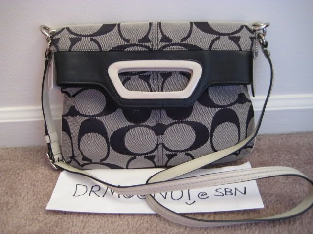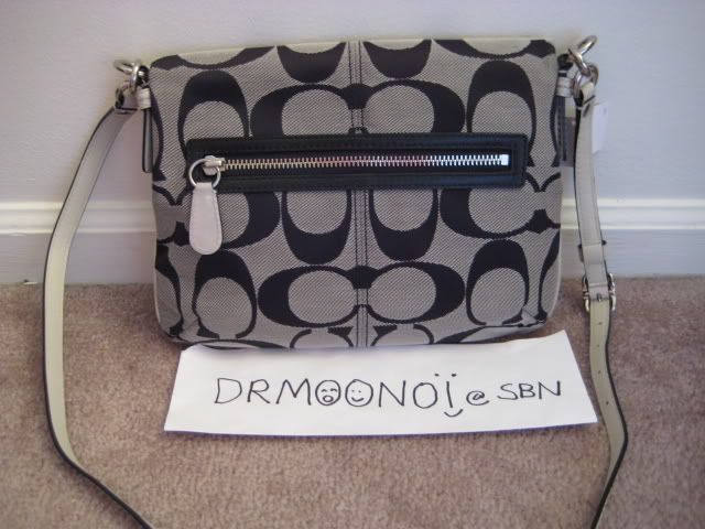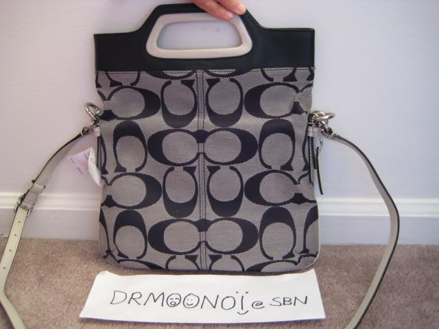 27. กระเป๋ารุ่น Bonnie Signature foldable crossbody สีดำคลาสสิค สายหนังสีขาว เป็นกระเป๋าขนาดกะทัดรัดจ้ะ ไม่ใหญ่ ไม่เล็กจนเกินไป แต่สายยาวถอดออกไม่ได้นะคะ กระเป๋ามาพร้อมอุปกรณ์ครบจ้ะ ขอขายที่ 6900 บาทนะจ้ะ