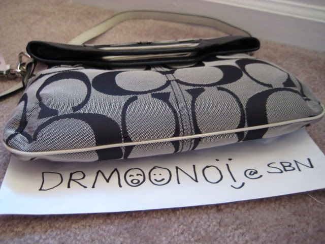 - ลาย signature สีดำหนังเงา ตกแต่งด้วยกระดุมปั๊มตราสีเงิน มีช่องใส่ของได้สามช่องนะคะ ด้านในบุด้วยผ้าสีฟ้าจ้ะ