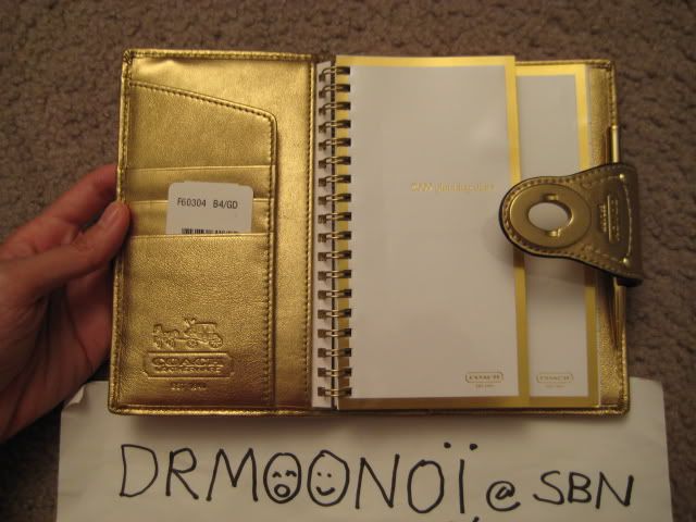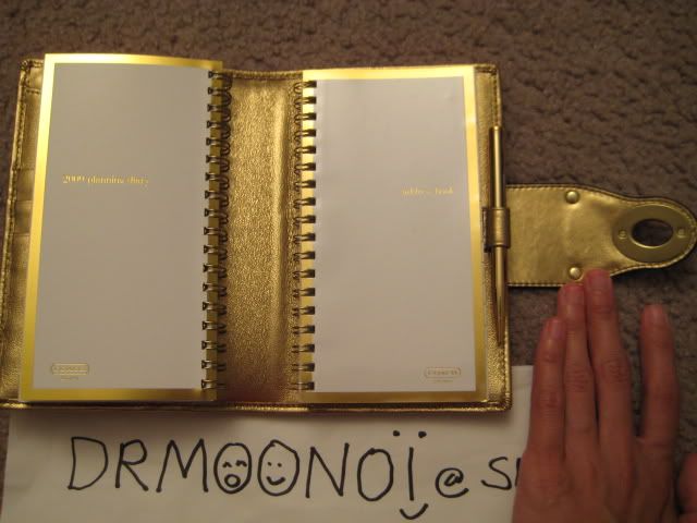 8. Agenda ปี 2009 เป็นหนังเมทัลลิคโทนสีทองอ่อนๆ นะคะ ที่ปิดเป็นปุ่ม turnlock ด้านปกในมีปั๊มลายรถม้าด้วยจ้ะ size 4" x 7" ราคา อยู่ที่ 3000 บาทนะคะ