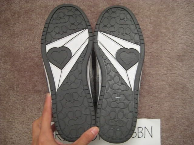 38. รองเท้าผ้าใบลาย signature สีโทนเทา-เมทัลลิคเงิน ด้านในหนานุ่มจ้ะ ตกแต่งด้วยลายปักรูปหัวใจด้านหลังรองเทา กะพื้นยางรองเท้าด้านล่างลายหัวใจเช่นเดียวกันจ้ะ น่ารักมากๆ size 7 = 3.5 = 23.5 ราคา 4000 บาท