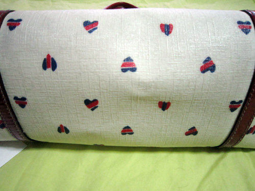 พื้นกระเป๋าเป็นสีขาว มีรอยคล้ำจากการใช้งานเป็นบางจุด เป็นที่ก้นและหลังกระเป๋าเนื่องจากเสียดสีกับเสื้อผ้า
