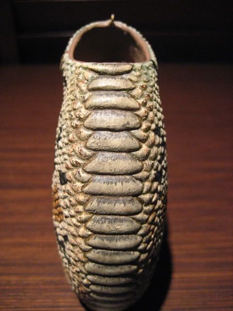 ผลงานชิ้นนี้เป็นลายหนังงูที่ใช้มือวาดด้วยความปรานีต พร้อมลายละเอียดของซิป เปรียบเสมือนของจริง