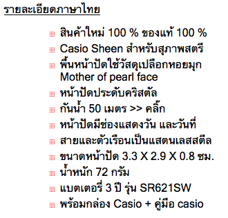 USED LIKE NEW! นาฬิกาข้อมือ CASIO SHEEN (คาสิโอ ชีน) SHE-4022D-4ADR (ประกันศูนย์เซ็นทรัล1ปี) สินค้าชิ้นนี้แม่ค้าเพิ่งซื้อมาเองค่ะ พอดีได้เรือนใหม่มาเลยขอส่งต่อค่ะ ใส่ไปแค่2ครั้งเองค่ะ แล้วเก็บใส่กล่องอย่างดี สภาพใหม่มากค่ะ ซื้อมาจาก เซ็นทรัลบางนาค่ะ ตัวนี้แม่ค้าตัดสายไป6ชิ้นค่ะ แต่มีสายที่ตัดพร้อมให้ค่ะ มีของทุกอย่างครบค่ะ กล่อง+ใบรับประกัน ตามรูปเลยนะค่ะ สินค้าชิ้นนี้นัดดูสภาพได้ค่ะ สะดวก เซ็นทรัลบางนาค่ะ ถ้าจะนัดดูสินค้า รบกวน มัดจำมา 1,000 นะค่ะ ป้องกันการไปเกล้อค่ะ ซื้อมาในราคา 3,000 กว่าไม่เกิน 3,500 ค่ะ ขอขายที่