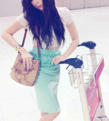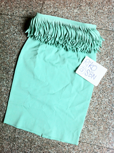 กระโปรงเข้ารูปสีเขียวพาสเทล แต่งพู่ตรงขอบเอวน่ารักมากๆค่ะ