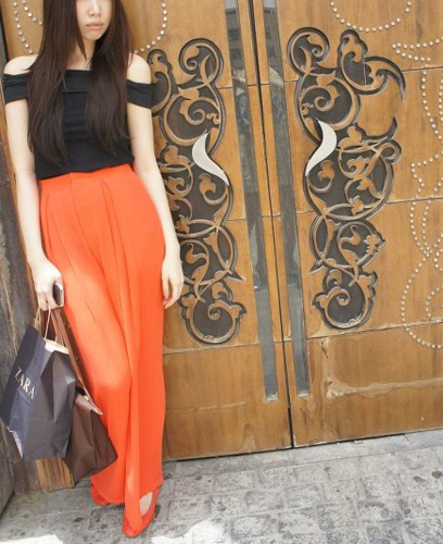 กางเกงขายาวเอวสูงสีส้มแดง US2