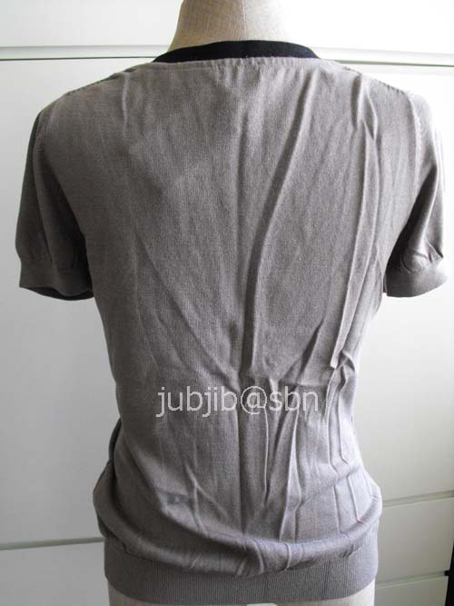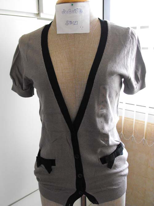 HM Cardigan เสื้อ H&M สีเทาอมน้ำตาลขอบดำ ตกแต่งด้วยโบว์ที่กระเป๋าด้านหน้า สามารถใส่เข้ากับเสื้อกล้ามหรือสายเดี่ยวน่ารักมากค่า สินค้าเป็นของใหม่จาก Shop Japan ค่า ขาย 999