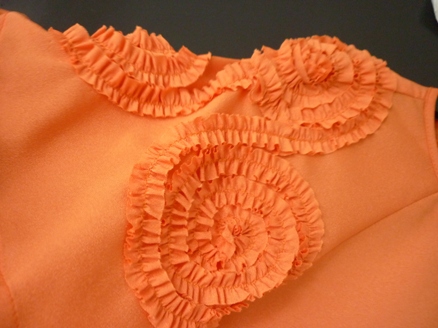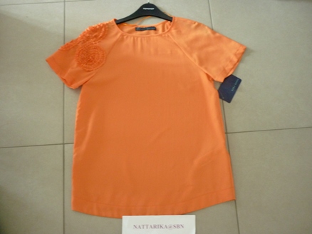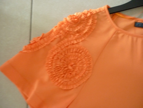 เสื้อสีส้มสดใสตรงหัวไหล่ทำเป็นดอกไม้น่ารักๆ