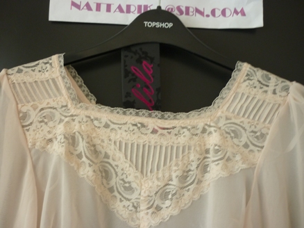 เสื้อผ้าชีฟองสีเบจ ปกบัวสีดำ ด้านหน้าทำเป็นชั้นๆเล็ก