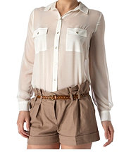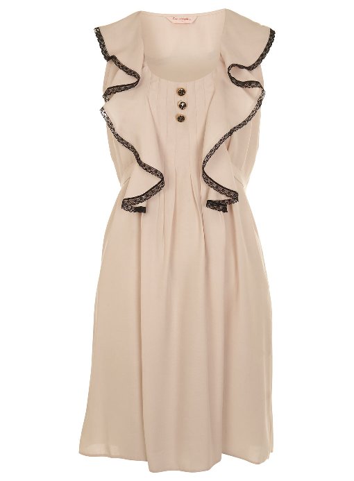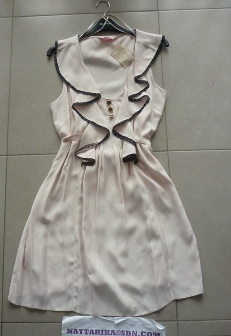 เสื้อผ้าชีฟองสีเบจ ปกบัวสีดำ ด้านหน้าทำเป็นชั้นๆเล็ก