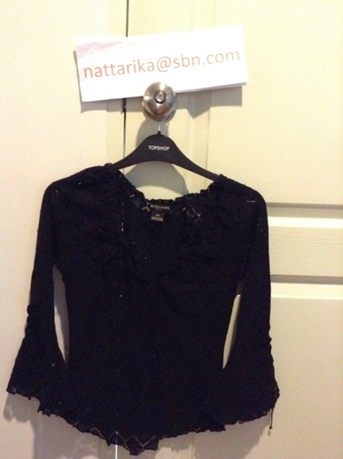 เสื้อคลุมผ้าเนื้อโปร่งสีดำ เนื้อผ้าจะคล้ายท้อปช้อปที่ชมพู่ใส่สีขาวน่ะคะ