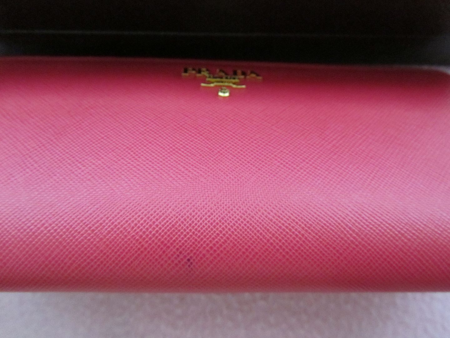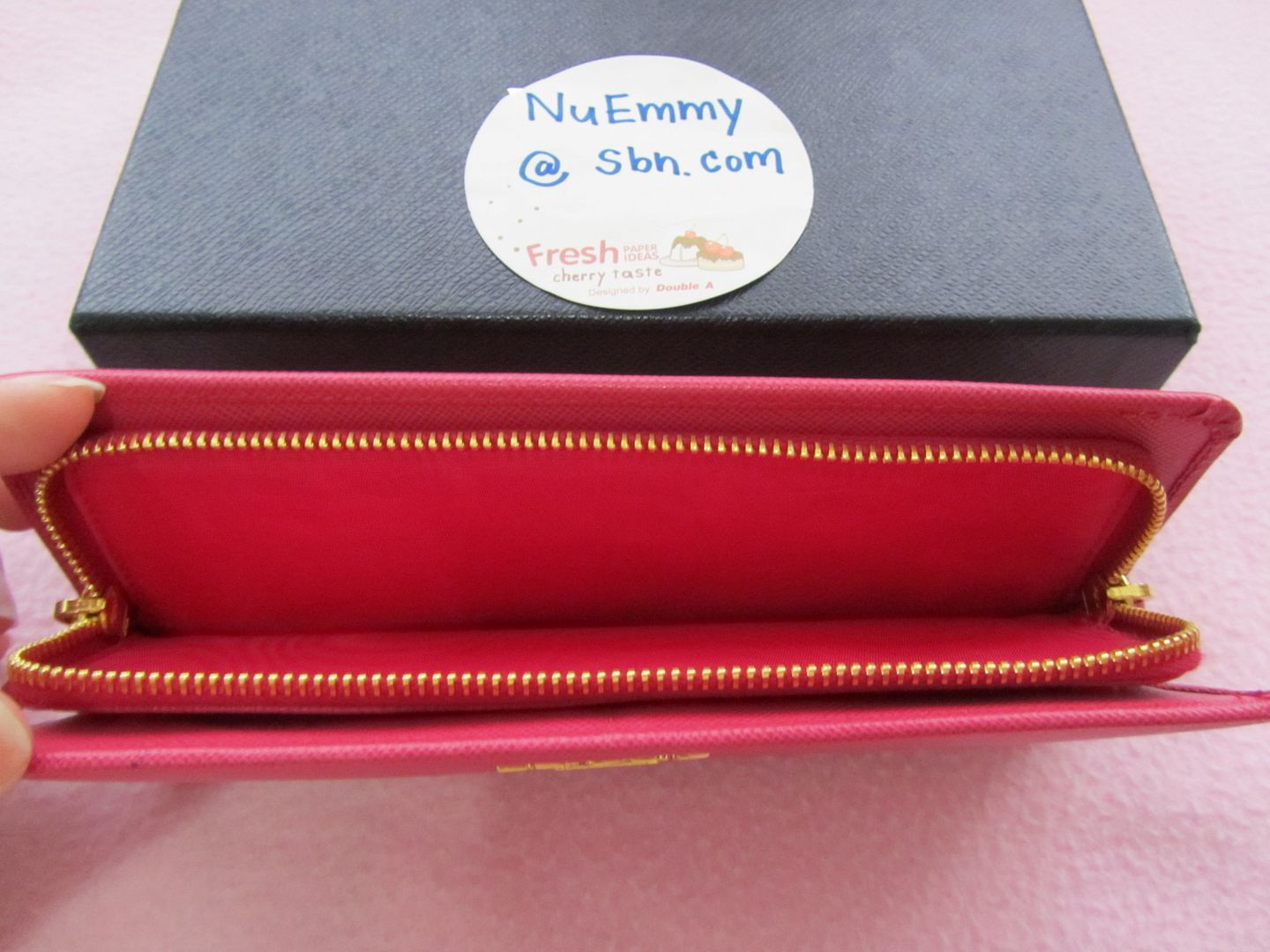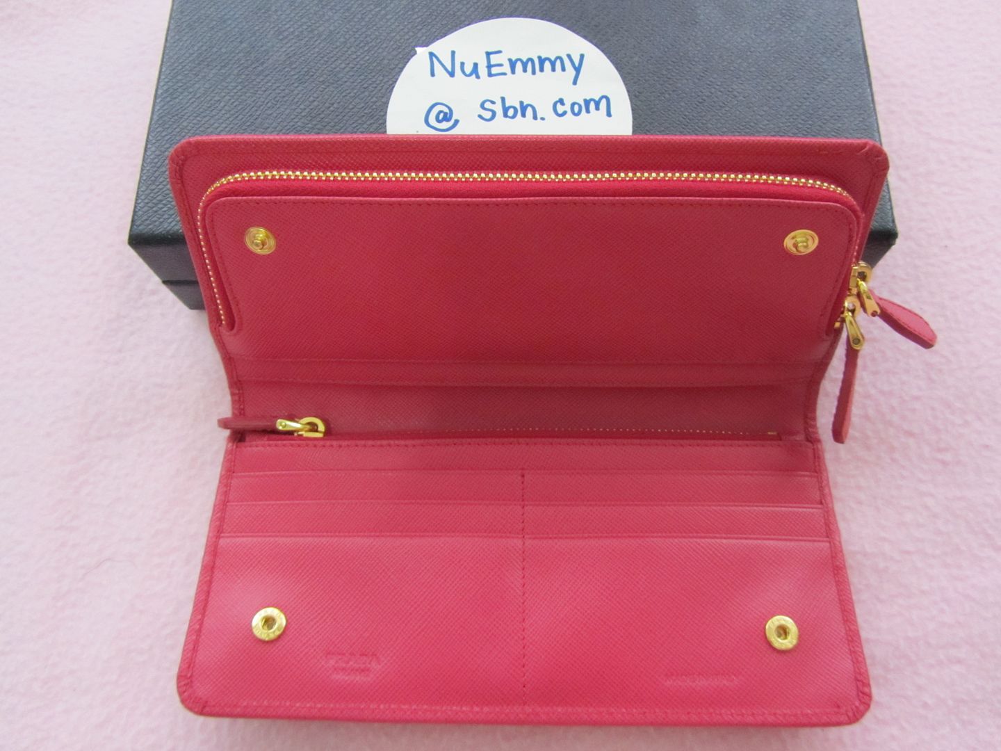 New Prada Insolite Long Wallet สีแดงอมชมพู ด้านนอกและในเป็นหนัง มีรอยเปื้อนนิดหน่อยตามรูป เพราะเป็นตัวโชว์ แต่ยังสวยมากๆๆ ค่ะ มีกล่องกับการ์ดพลาสติกค่ะ
