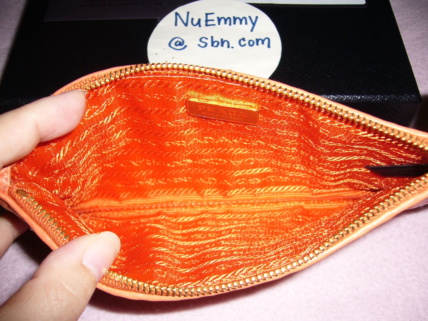 New Prada Long Wallet สีส้ม เป็นหนังย่นๆ น่ารักสุดๆ ขนาด 20*11 cm ด้านนอกมีตำหนิเป็นรอยเปื้อนนิดนึงตามรูปนะคะ แต่ยังน่ารักอยู่มากๆ ไม่มีผลต่อการใช้งานค่ะ มีกล่องกับการ์ดพลาสติกค่ะ