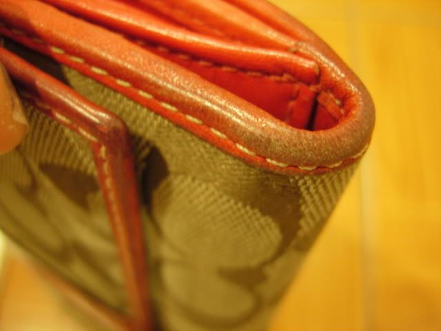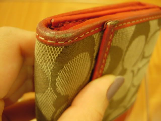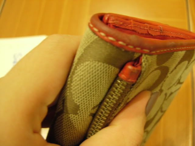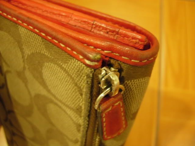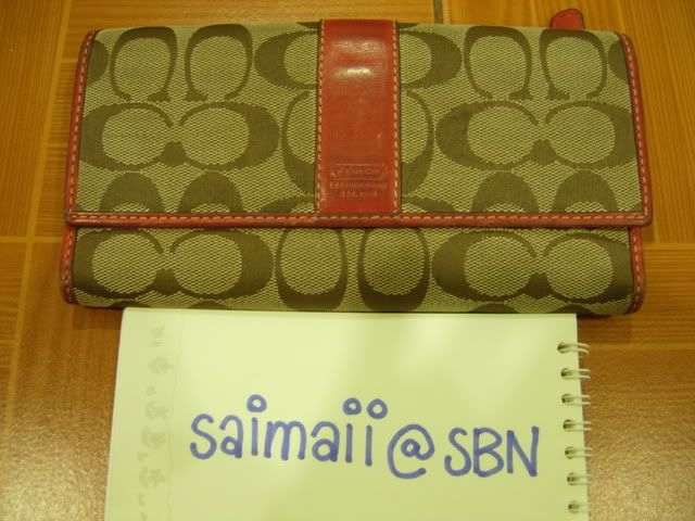 COACH SIGNATURE WALLET สภาพใช้งานค่ะ ซื้อมาเองกับมือที่ Citygate Outlet ที่ HK รุ่นนี้สวยมากค่ะ มีช่องใส่เหรียญเป็นซิปด้านนอก ใส่การ์ดได้ 12 ช่อง ใส่ธนบัตรได้ 3 ช่อง จุเยอะมากๆค่ะ ตัวกระเป๋าเป็นผ้านะคะ มอมๆนิดหน่อย ถ้าเอาไปซักหน่อยก็จะวิ้งเลยค่ะ ส่วนตรงสีแดงเป็นหนัง ก็จะมีดำๆบ้างตามระยะเวลาการใช้งาน ตามมุมมีรอยถลอกค่ะ ถ้าเอาไปใช้แบบขำๆไม่คิดอะไรมากก็โอเคอยู่ค่ะ ตำหนิใหญ่ๆของใบนี้คือแป๊กติดกระเป๋าเสียค่ะ เคยไปถามที่ shop แล้วเค้าบอกว่า coach ไม่มีอะไหล่เปลี่ยนให้ค่ะ แต่ทางร้านจะส่งซ่อม mr.bag fix ซึ่งจะเป็นแป๊กแบบธรรมดา แต่คิวยาวมาก SA บอกว่าไปซ่อมเองที่ mr.bag fix ก็ได้ค่ะ แล้วก็ตำหนิอีกจุดคือมีรอยปากกาที่ฝาปิดกระเป๋าด้านใน ดูรูปได้ด้านล่างค่ะ ขอขาย 1250 >> 1000 (พร้อมโอน) บาท