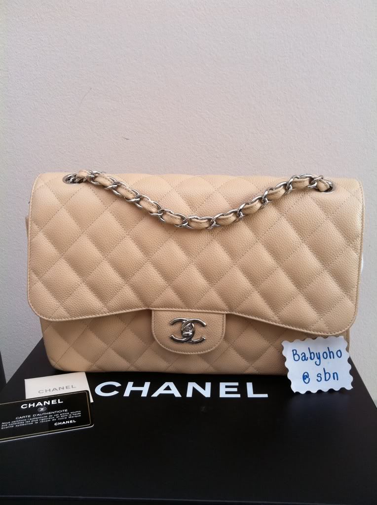 6. New Chanel Classic, Jumbo 12', Caviar, Beige , SHW...Double flap