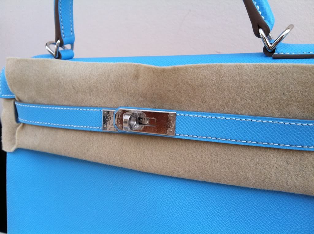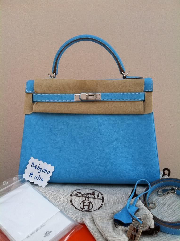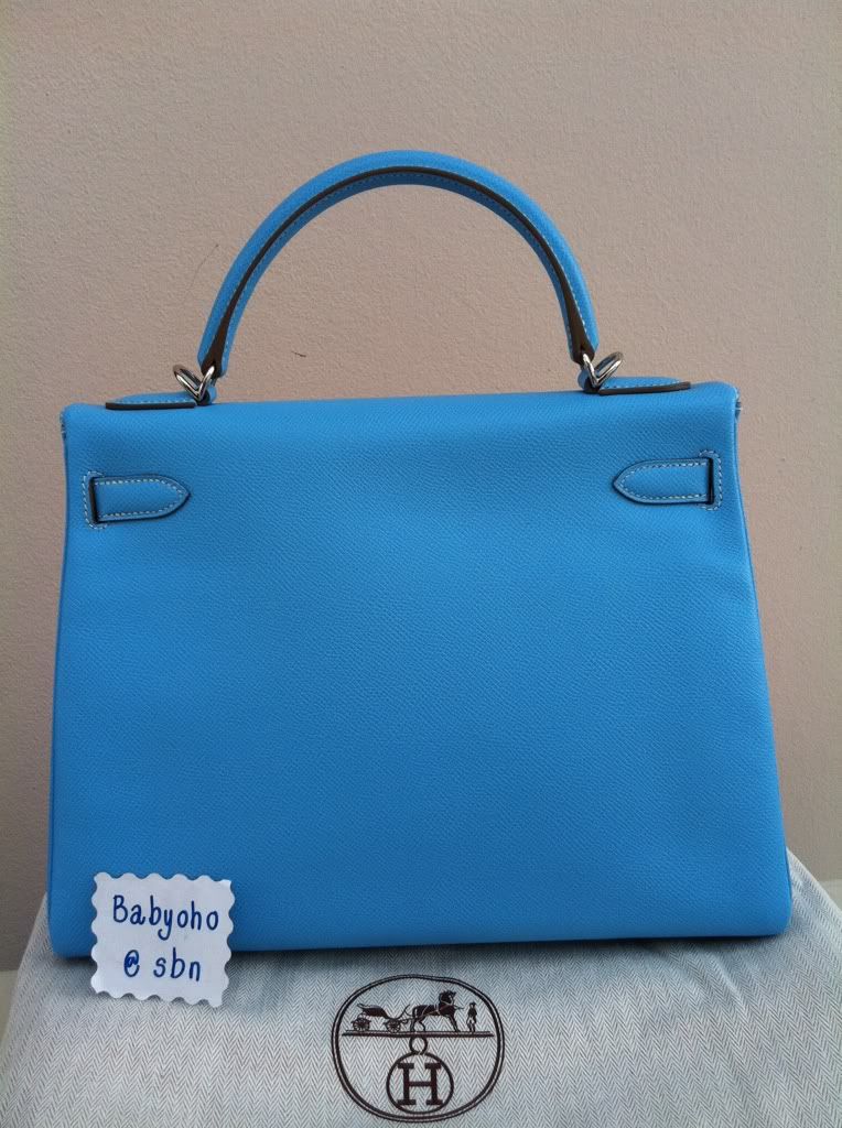 4. New Hermes Kelly 32, Blue Celeste + Blue Mykonos color, Epsom, PHW, Stamp O>>