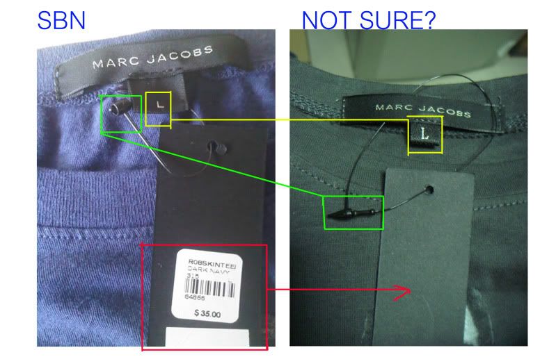 ลองพลิกป้ายข้างในเสื้ออะครับจะมีป้ายสีขาวๆป้ายตัวนั้นจะต้องเปนป้ายกระดาษแข็งๆที่ซักเท่าไหร่ก้ไม่นิ่มอะครับลองดูนะครับ แล้วตัวสกรีนเวลาลูบมันจะสากๆเลยอะครับตรงป้ายแท็ก คำว่าmarc จะต้องนูนออก ส่วนคำว่าby marc jacobsจะต้องยุบลงไปเวลาสัมผัวนะครับ