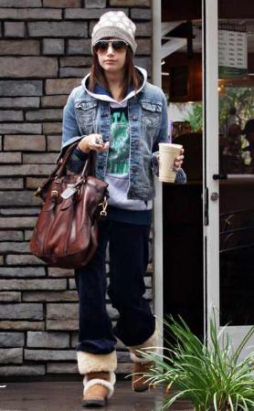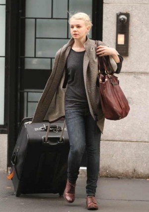 คาเมรอน ดิแอซ หิ้วกะเป๋าหนังกวางแบบไล่สีเทาที่ไหล่ขวา