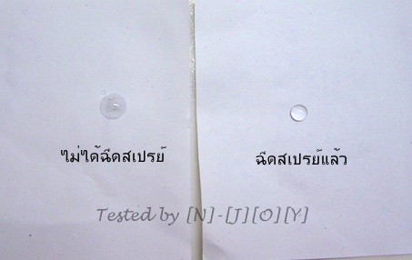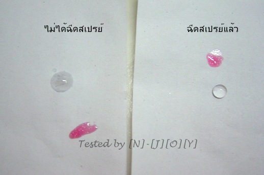 จะเห็นว่า กระดาษแผ่นที่ไม่ได้ฉีดสเปรย์ไว้ จะมีน้ำซึมลงเปียกกระดาษทันที และบางส่วนยังค้างอยู่บนผิวกระดาษ ในขณะที่กระดาษแผ่นที่มีการฉีดสเปรย์ไว้แล้ว จะมีหยดน้ำเกาะอยู่บนผิวกระดาษเท่านั้น ไม่ซึมลงไปเปียกเนื้อกระดาษ