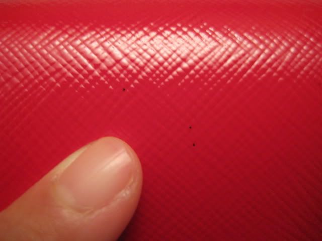 รับประกันว่าเป็นกระเป๋าใบใหม่ 100% ค่ะ แผ่นพลาสติคยังติดอยู่เลย แต่จะเห็นว่าจะมีจุดสีดำที่เล็กมากๆ สามจุดอยู่บนตัวหนังนะคะ เป็นที่ตัวหนังเอง ไม่ได้เป็นรอยเปื้อนใดๆค่ะ เพราะหนังรุ่นนี้ทุกใบที่ห้าง เท่าที่พี่ลองเช๊คดูแล้วจะมีลักษณะแบบนี้ทุกใบน่ะค่ะ ถ้าไม่สังเกตจริงๆจะมองแทบไม่เห็นเลย เพราะเนื้อของหนังจะเงามากๆค่า