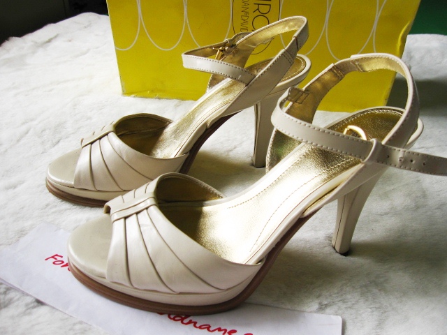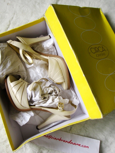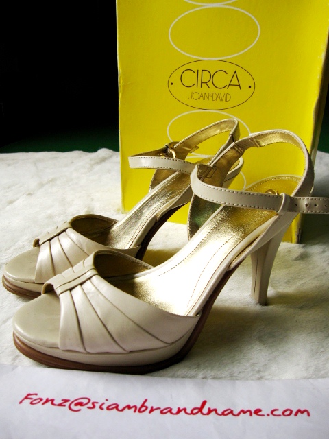 เป็นรองเท้าหนังสีครีม สูงประมาณ 4 นิ้ว Platform ยกขึ้น ใส่แล้วไม่เมื่อยคะ