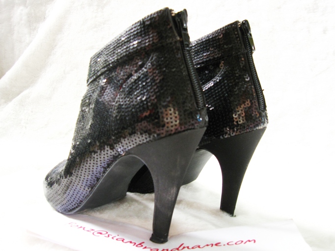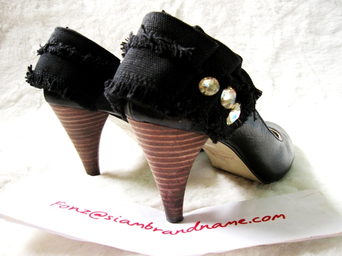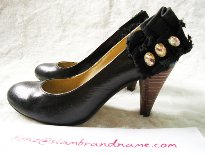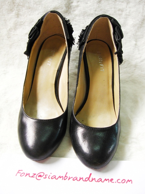 เป็นรองเท้าหนังสีดำนะคะ ด้านหน้าดูเรียบๆ แต่ด้านหลังแอบเก่แต่งระบาย ติด Cristal