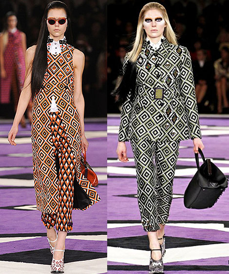 รูปทรงเรขาคณิตขาดใหญ่ เสื้อผ้า Prada เล่นกับมุมมองของศิลปะแบบ Op Art (ภาพลวงตา) กราฟิกที่น่าตื่นตาตื่นใจและงาน popping ในรูปแบบที่บางครั้งดูเหมือนจะไม่สอดคล้องกัน, ไม่จำเป็นต้องยึดติดกับรูปแบบใดๆ ส่วนใหญ่อยู่ในรูปแบบบนงาน jacquards ปูพรมสีแดงที่สมบูรณ์แบบสำหรับฤดูใบไม้ร่วงและฤดูหนาว
