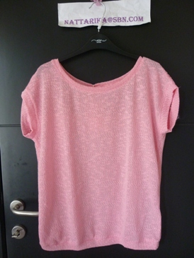 เสื้อสีชมพูโอรสปกบัวแขนสั้น ดีเทลใต้ปกเป็นผ้าลูกไม้ลายจุด