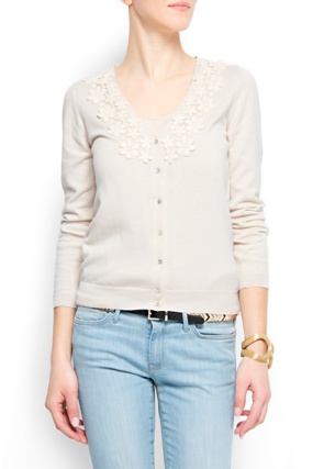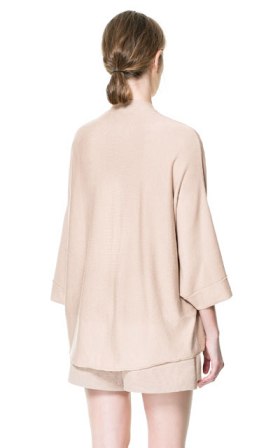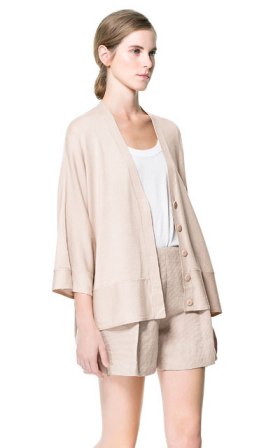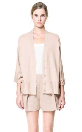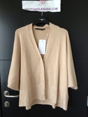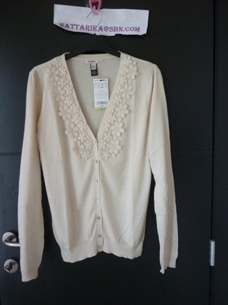 เสื้อคาดิแก้นสีครีมใส่แบบคลุมไม่มีกระดุม แขนประมาณศอกพับเบิ่ลปลายแขน