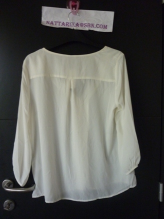 เสื้อสีขาวครีม ดีเทลคริสตัลเหมือนสร้อยที่คอ แขนป่องๆน่าร้าก