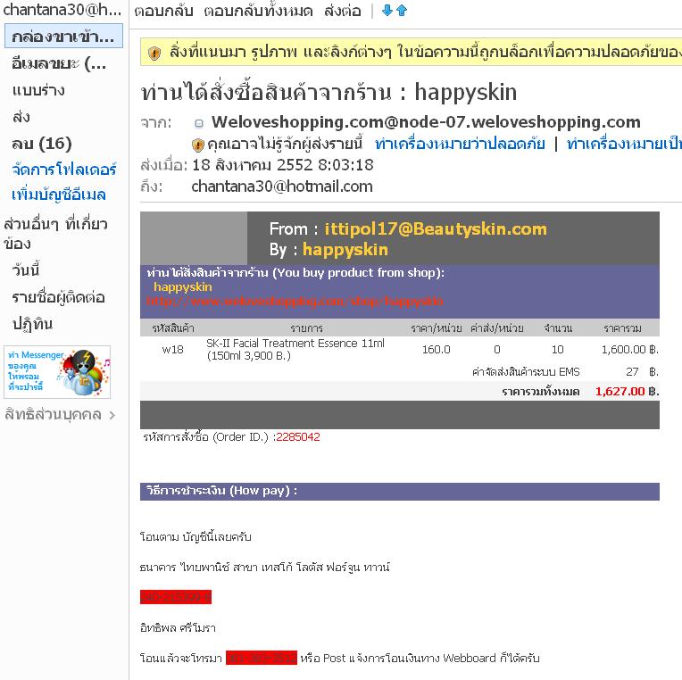 สืบเนื่องจากดิฉันเข้าไปหน้ากระทู้ของ อิทธิพล17 และพ่อค้าได้ลงลิ้งหน้าร้านของตัวเองที่อยู่กับทาง weloveshopping ชื่อร้านของคุณ อิทธิพล17 คือ Happyskin