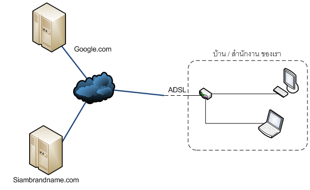 อินเตอร์เน็ตนั้น ถ้าว่ากันตรงๆ ก็คือ โครงข่ายสากล ที่เชื่อมคอมพิวเตอร์ทั้งหลายเข้าด้วยกัน โครงข่ายสากลนั้น เปรียบเหมือน ถนนเส้นใหญ่ ที่มีตึกรามบ้านช่องตั้งอยู่เต็มไปหมด (อาคาร (เครื่อง Server) ของ Siambrandname.com หรือ Google.com ก็ตั้งอยู่บนถนนเส้นหลักครับ) ส่วน โครงข่ายส่วนตัว ในบ้าน หรือ ในสำนักงานของเรานั้น เปรียบเหมือน ซอยย่อย ที่แตกออกมาจากถนนเส้นใหญ่