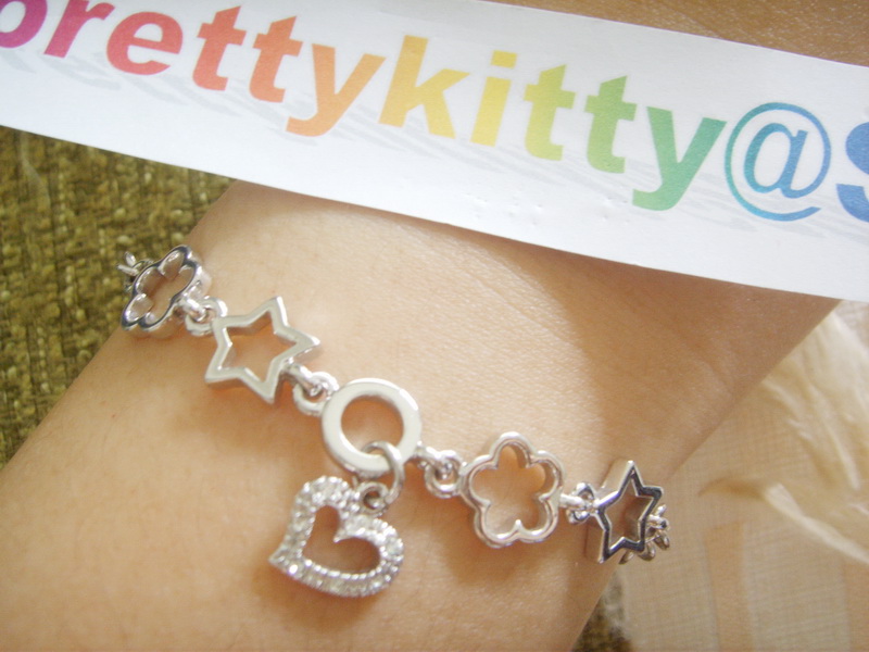 16. กำไลข้อมือน่ารักประดับดาวและกลีบดอกไม้ห้อยด้วยหัวใจชิ้นนี้เป็นของ Solene Claire ค่ะ มีใบรับประกันซื้อที่ Central บางนา ใส่ห้อยน่ารักๆ นะค่ะ ขอขายขำๆ ที่ราคา 400 บาทค่ะ