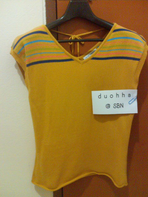 ตัวที่ 2 เสื้อสีเหลือง blue corner size L ผ้านิตติ้ง คอวี ด้านหลังมีเชือกผูก อก 30 ยาว 22 ได้มาพร้อมกับตัวสีฟ้าข้างบน ได้มาแล้วยังไม่เคยใส่เลย นอกจากลองอย่างเดียว สภาพดีค่ะ