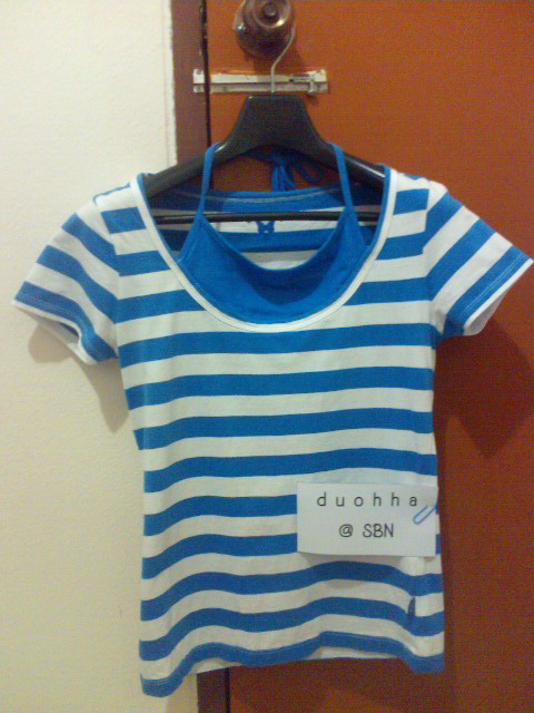 ตัวที่ 3 เสื้อ AIIZ size S สีฟ้าลาย มีสีฟ้าเข้มโผ่บริเวณหน้าอก+สายคล้อง คล้าย ๆ กับใส่ 2 ตัว (แต่เป็นตัวเดียว ติดกัน) เก๋มากค่ะ ตัวนี้สายคล้องมีรอยนิดหน่อย ส่วนตัวเสื้อสภาพดี ของแม่ค้าเองค่ะ ซื้อมาได้ใส่แค่ครั้งเดียวเพราะมันฟิต ๆ (แม่ค้าน้ำหนักขึ้น) เลยปล่อยดีกว่า